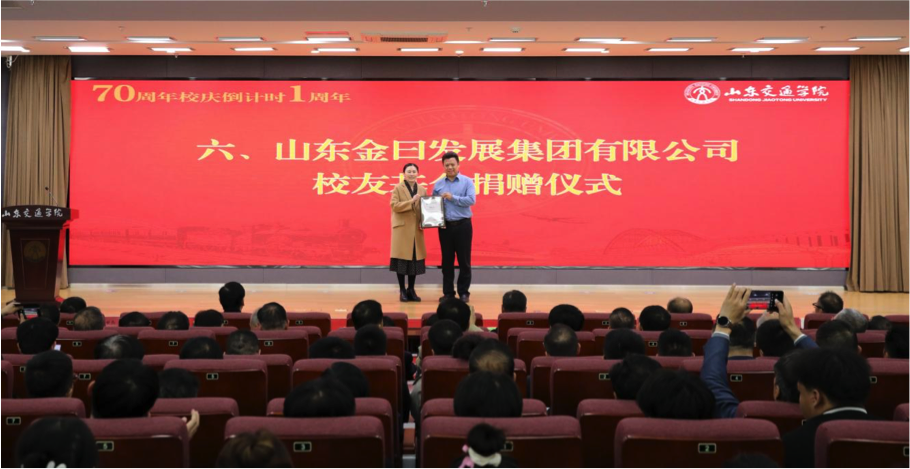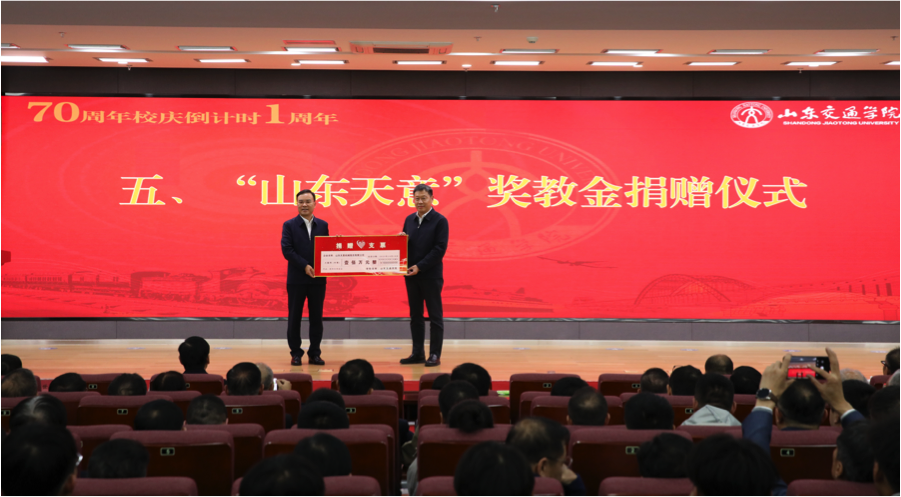 在捐赠环节,山东天意机械股份有限公司出资设立“山东天意”奖教金,山东金曰交通发展集团有限公司捐赠校友基金,王伟,党委委员、副院长徐静分别为捐赠单位代表刘洪彬、熊大路颁发捐赠证书。