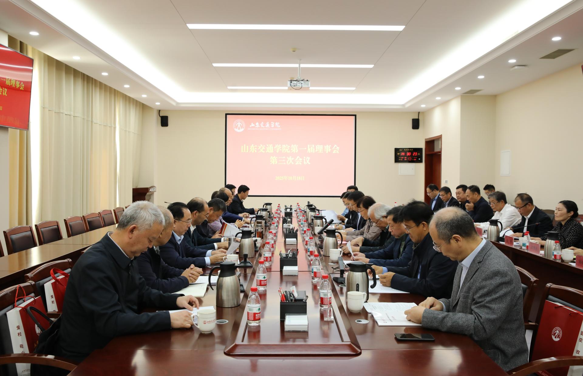 10月18日下午,山东交通学院第一届理事会第三次会议在长清校区明德楼301会议室山召开。理事会名誉理事长、学校原党委书记孙秀丽;副理事长,北京茅以升科技教育基金会副理事长兼道路交通委员会会长刘文杰;副理事长,省社会科学界联合会原一级巡视员、副主席、党组副书记、教授周忠高;副理事长,省政协常委、济南市政协副主席,民革中央委员、山东省委会副主委、济南市委会主委王伯芝;副理事长,省体育局原副局长徐大义;副理事长,蓝海建设集团有限公司董事长刘卫峰;常务理事,省交通运输厅总工程师、二级巡视员赵方德;常务理事,潍坊学院党委书记来逢波;理事会秘书长,学校原副院长徐晓红;常务理事,学校原副院长孙云早;常务理事,学校原副院长姜华平;常务理事,山东高速科技发展集团有限公司原总经理郭长路;常务理事,山东交通职业学院党委副书记、校长楚金华;常务理事,泰山学院党委委员、副校长田杰昌;常务理事,济南公共交通集团有限公司总经理颜廷虎;常务理事,山东高速集团创新研究院党总支书记、院长毕玉峰;常务理事,山东金曰交通发展集团党委书记、董事长熊大路;学校党委书记王伟,党委副书记、院长孔伟金,党委副书记李贞涛,党委委员、副院长王保群,党委委员、副院长徐静,党委委员、党委统战部部长刘庆波出席。会议由理事会秘书长徐晓红主持。