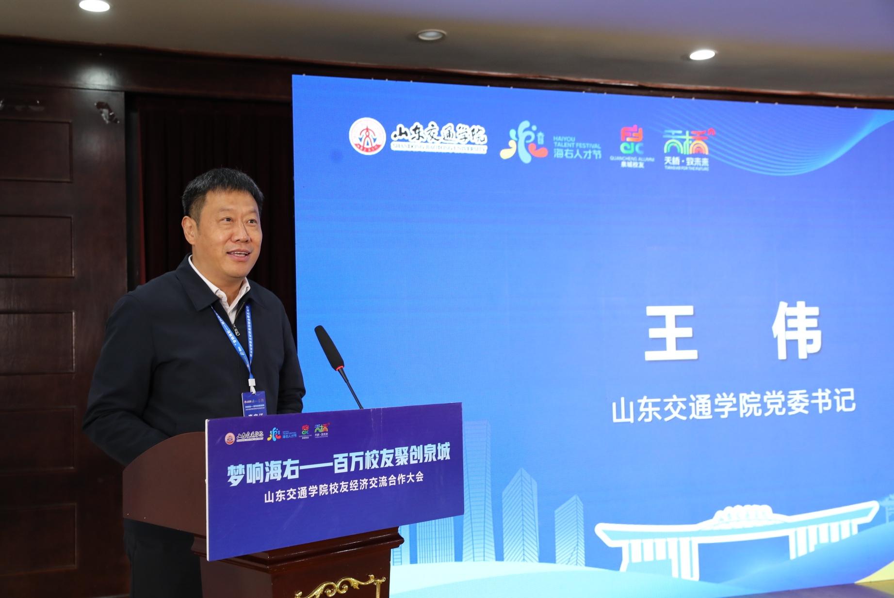 王伟代表学校作主旨讲话。他从“因交通而生、应交通而兴、为交通而强”三个方面,系统阐述了学校依托深厚行业积淀的办学根基、办学层次的跨越式提升、特色化人才培养体系的构建、科研创新能力的显著优势、高水平开放办学格局的形成,以及服务国家和区域发展的突出成效。他指出,学校正迈向高质量发展的关键阶段,比以往任何时候都更加迫切需要地方政府的政策赋能、行业协会的桥梁纽带、广大校友与友好单位的鼎力支持,以汇聚起推动发展的强大合力。他围绕时代大势、城市沃土、母校根基三个维度,勉励各位校友持续发挥优势,在济南天桥这片热土上,共同书写校友与母校共成长、与城市共繁荣的崭新篇章。他倡议,通过共建“校友发展共同体”、共筑“人才培养立交桥”、共绘“校地企合作新图景”,将交院智慧转化为服务强国建设的硬核力量。