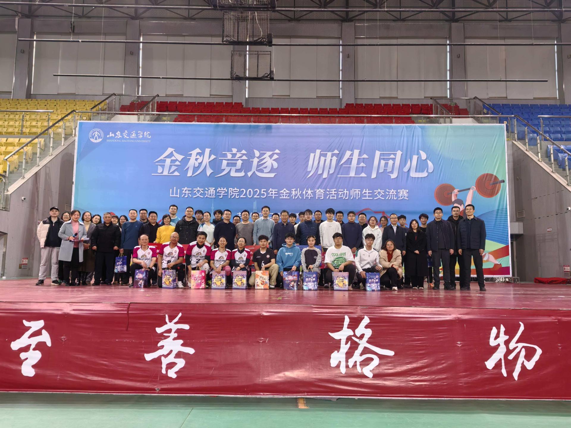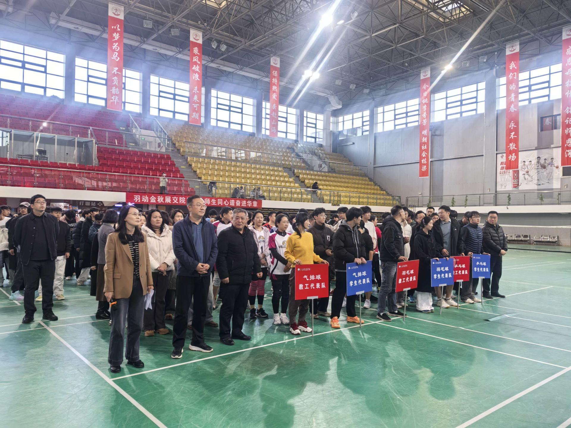 11月19日下午,学校工会、体育教学部、团委在长清校区体育馆联合举办“金秋竞逐 师生同心”2025年金秋体育活动师生交流赛。学校党委书记王伟,党委副书记李贞涛,党委委员、党委组织部部长王兴盈出席。活动由工会主席闫晓阳主持。