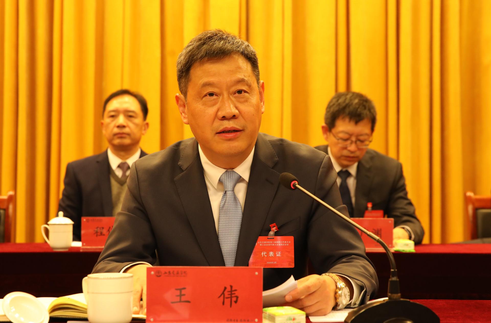 党委书记王伟在讲话中指出,面对交通强国、教育强国建设的战略机遇,面对高等教育内涵式发展的时代要求,面对同类院校你追我赶的竞争态势,我们必须凝心聚力、真抓实干,确保新征程开好局、起好步。针对学校工作,他提出三个方面要求。一是提高政治站位,校准目标方位,凝聚推动学校高质量发展的思想共识。以习近平新时代中国特色社会主义思想为指导,扎实开展树立和践行正确政绩观学习教育,筑牢思想根基、认清发展形势、强化使命担当,要继承和弘扬“交院人精神”,坚守立德树人根本任务,锚定 “应用型”定位,突出“交通”特色优势 ,凝聚奋进力量。二是聚焦重点任务,加强统筹谋划,全力推进 “十五五” 规划编制与年度工作落实。要高水平编制规划,突出战略引领性、共识凝聚性、可操作性;高质量完成2026年“内涵建设攻坚年” 工作任务,聚焦8项重点工作精准突破,统筹推进40项主要工作协调发展;要健全督查、考核、协同保障机制,确保落地见效。三是深化民主管理,汇集发展合力,充分发挥双代会在学校治理中的重要作用。进一步发挥双代会优势,汇聚智慧、凝聚力量,为学校高质量发展凝聚治理合力。