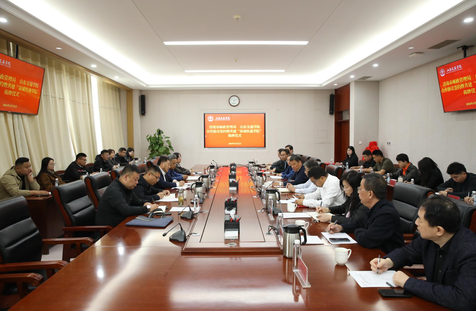 4月21日,济南市邮政管理局与山东交通学院合作协议签约暨共建“泉城快递学院”揭牌仪式在长清校区明德楼303会议室举行。济南市邮政管理局党组书记、局长范涛,党组成员、副局长宋克建;学校党委书记王伟,党委委员、副院长王保群,党委委员、副院长张萌萌出席。仪式由张萌萌主持。