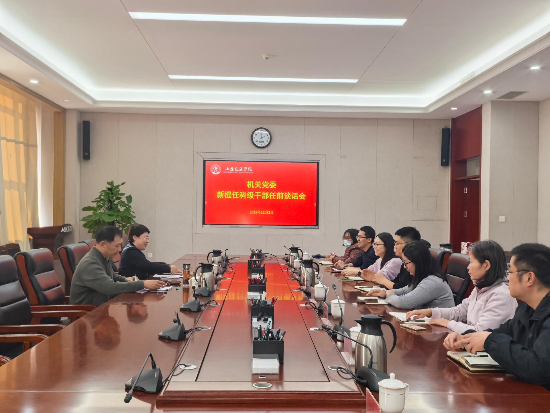 12月2日,机关党委在长清校区明德楼会议室召开新提任科级干部集体谈话会。学校纪委副书记、机关党委纪检委员程伟渊出席会议并进行廉政谈话,机关党委书记闫荣双主持会议并提出工作要求。