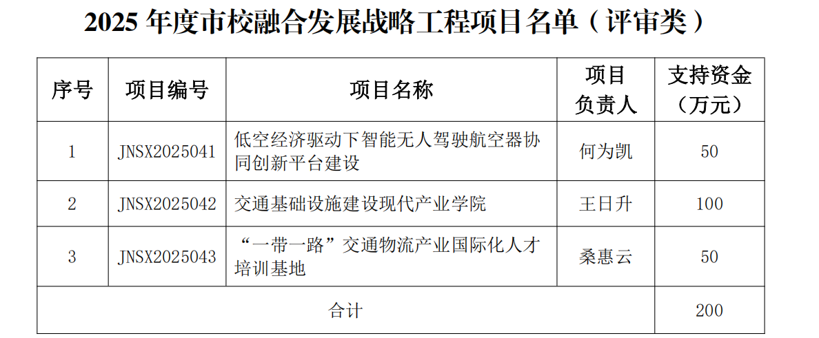 近日,济南市教育局公布了2025年度济南市市校融合发展战略工程项目立项名单。我校申报的“低空经济驱动下智能无人驾驶航空器协同创新平台建设”“交通基础设施建设现代产业学院”以及“‘一带一路’交通物流产业国际化人才培训基地”三个项目全部成功获批,共获得支持资金200万元。