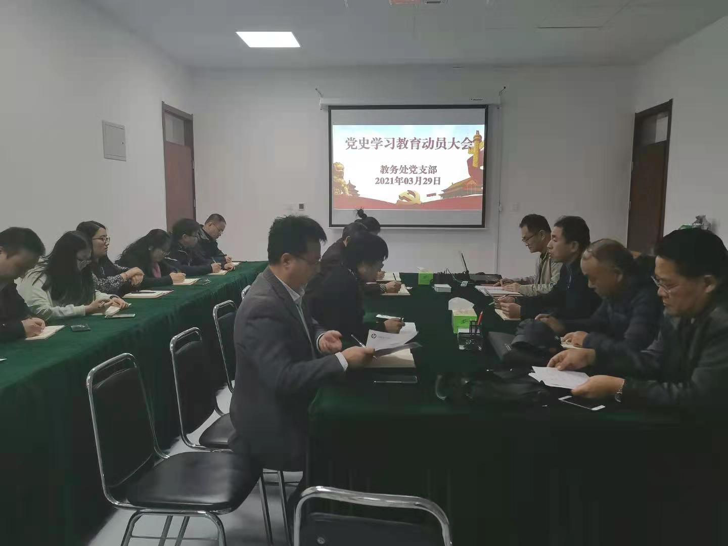 3月29日下午,教务处党支部在长清校区明德楼229会议室召开党史学习教育动员会。会议由党支部宣传委员王德利主持。