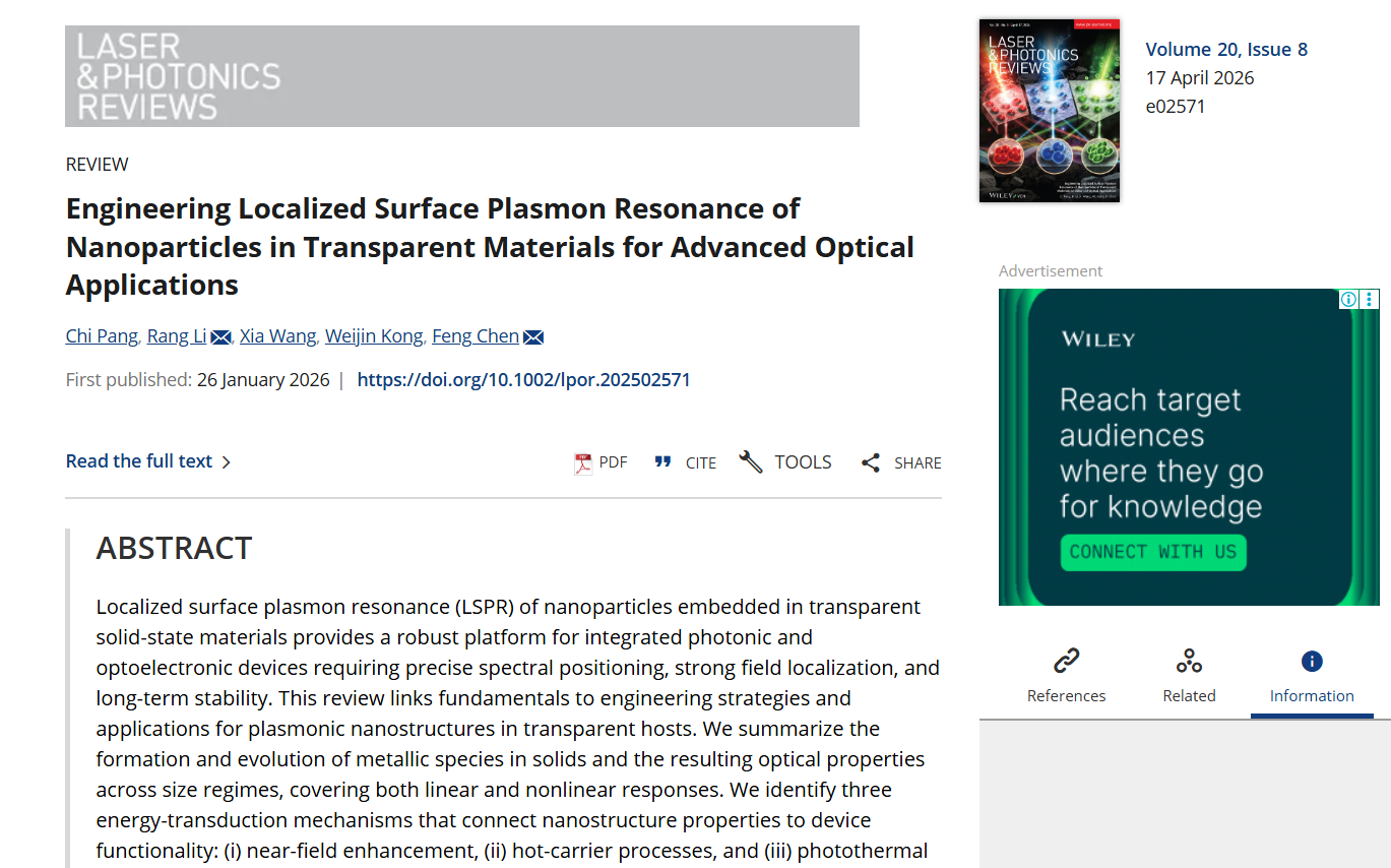 我校理学院逄驰教授以第一作者身份在光学国际知名期刊《Laser & Photonics Reviews》上发表了题为“Engineering Localized Surface Plasmon Resonance of Nanoparticles in Transparent Materials for Advanced Optical Applications”的综述论文,并被当期杂志选为封面论文(Front Cover)。该论文的通讯作者为山东大学陈峰教授和济南大学李让副教授,山东交通学院理学院为第一完成单位。